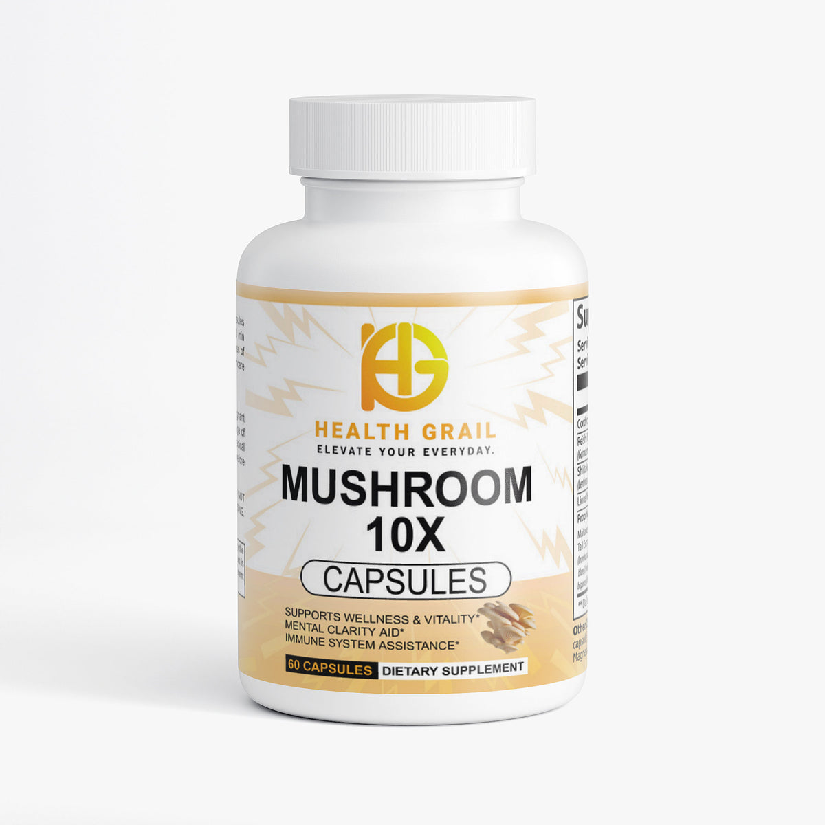 Unlock nature’s full power for your mind & body with our Mushroom Complex 10X. This advanced capsule blends a full-spectrum of elite functional mushrooms—like Lion’s Mane, Cordyceps, Reishi, Chaga, Maitake, Shi‑itake and Turkey Tail—each working in synergy to sharpen focus, bolster immune resilience, and promote clean, steady energy.