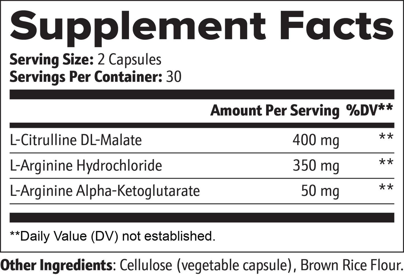 Ingredients: L-Arginine Alpha-Ketoglutarate, L-Arginine Hydrochloride, L-Citrulline DL-Malate, Cellulose (vegetable capsule), Brown Rice Flour.