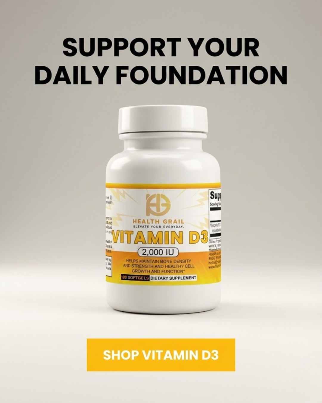 Health-Grail Vitamin D3 (2,000 IU) delivers a clean, effective daily dose of this essential nutrient so you can support your bones, strengthen your immune system, and stay energized all year long.